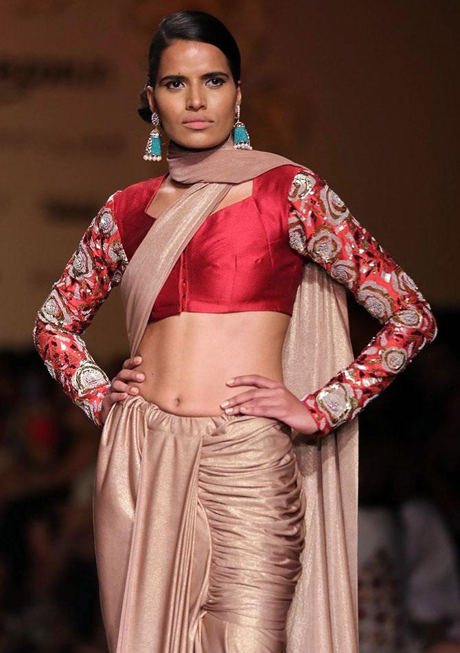 The new trend is to pair your saree with a shirt. A plain saree with a printed shirt or an embroidered saree with a plain contrast shirt gives you a ravishing look. Full sleeve shirt or three-fourth sleeve shirt makes the best pair with a saree.